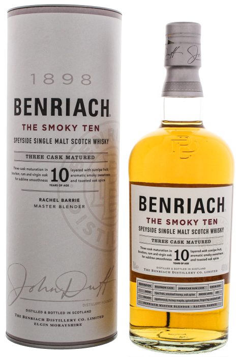 BenRiach The Smoky Ten Three Cask Matured Speyside Single Malt Whisky is afkomstig van de BenRiach Distilleerderij uit Schotland en heeft 10 jaar gerijpt in 'The Three Cask': bourbon-, geroosterde virgin oak en Jamaicaanse rum vaten.