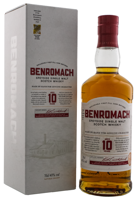Benromach 10YO afkomstig uit Gordon en geproduccerd door de MacPhail 's Benromach distilleerderij. De whisky heeft de eerste negen jaar gerijpt in bourbon 4/5 en 1/5 sherryvaten, alvorens een jaar in sherry vaten.