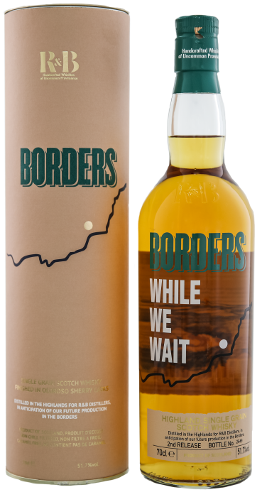 Borders While We Wait Single Grain Scotch Whisky 2nd Release is een interessante graanwhisky bestaande uit 50% gemoute gerst en 50% tarwedie terugkeert om het 'Borders'-deel van ambachtelijke distilleerders Raasay en Borders te vertegenwoordigen.