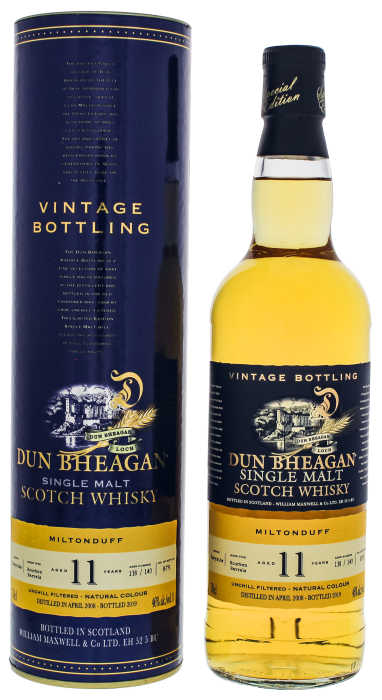 Dun Bheagan Miltonduff 11YO 2008/2019 Bourbon Barrel Finish Single Malt Whisky werd gedistilleerd in april 2008 en heeft gerijpt in een paar bourbonvaten.