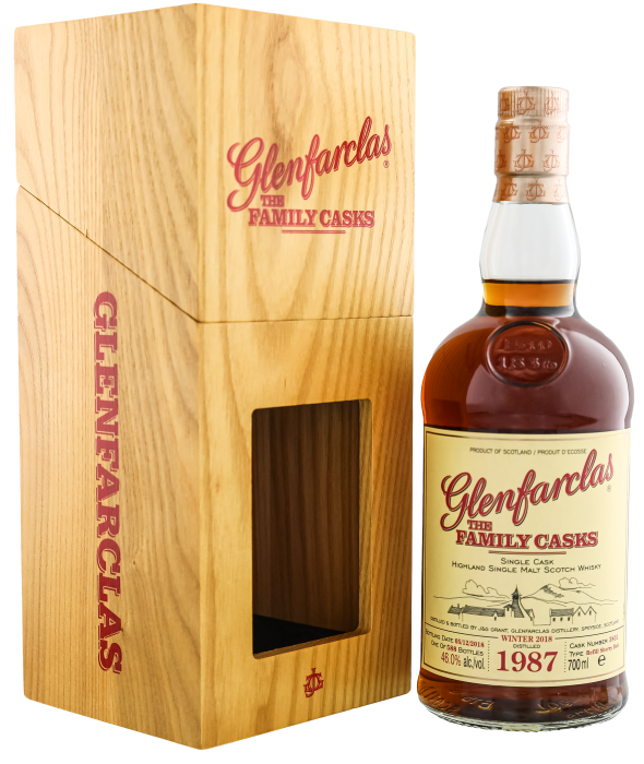 Glenfarclas The Family Casks 1987/2018 Highland Single Malt Scotch Whisky is een 31 jaar oude gelimiteerde whisky afkomstig uit de luxe Family Casks serie uit Schotland en heeft gerijpt in refill sherry vaten.