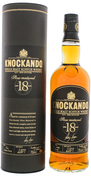 Knockando Slow Matured 18YO 2001 Single Malt Scotch Whisky is afkomstig van de Knockando Distillery, wat 'kleine zwarte heuvel' betekent in Gaelic, gelegen in het midden van de Speyside, een regio in Schotland die bekend staat om zijn hoogwaardige whisky's.