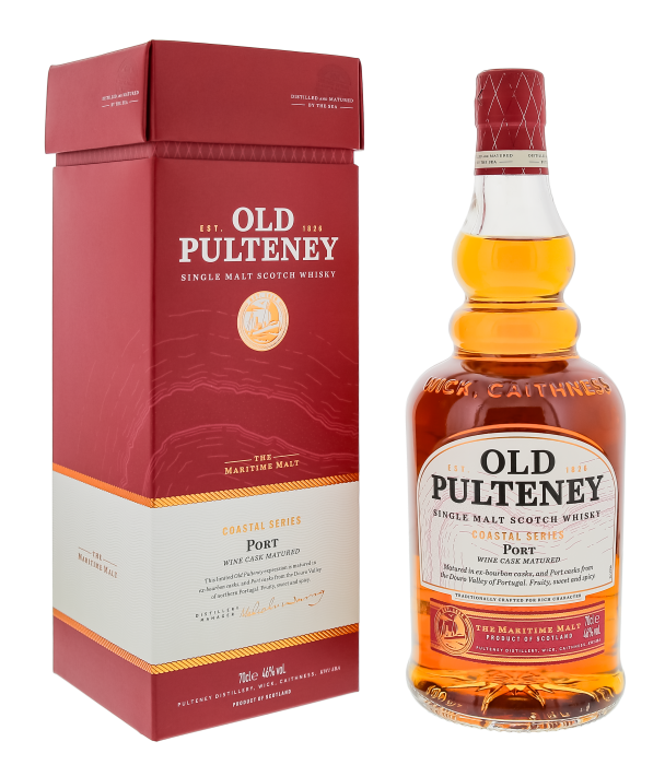 Old Pulteney Coastal Series Port Wine Cask Matured Single Malt Scotch Whisky is de tweede whisky in de Coastal Serie, die naast ex-Bourbonvaten ook gerijpt heeft op portvaten uit de Dourovallei in het noorden van Portugal.