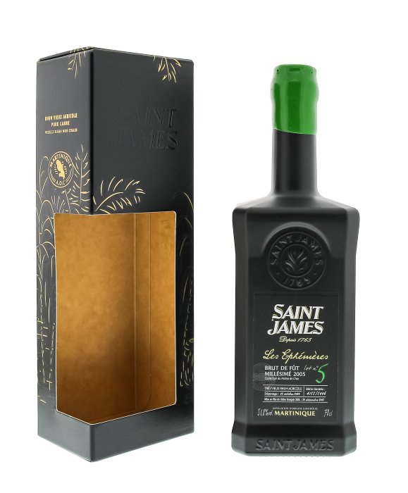 Saint James Les Ephemeres Nr. 5 Brut de Fut 2005 is een eerbetoon aan de Grand Crus en is een embleem van de 2005 jaarwisseling. De rum heeft gedistilleerd in een creoolse colonne en is gebotteld in de kelders van Saint-Marie.