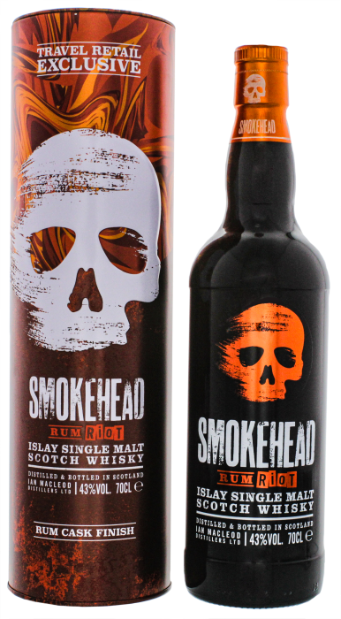 Smokehead Riot Rum Cask Finish Islay Single Malt Scotch Whisky heeft gerijpt in ex bourbonvaten en is verder afgewerkt in Caribische rum vaten.