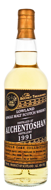 The Secret Treasures Auchentoshan 17 years old Lowland Single Malt Whisky 1991 is een vintage single malt limited edition uit de Lowlands van Schotland en werd in 1991 werd gedistilleerd in de Auchentoshan distilleerderij en heeft vervolgens 17 jaar gerijpt in een bourbonvat.