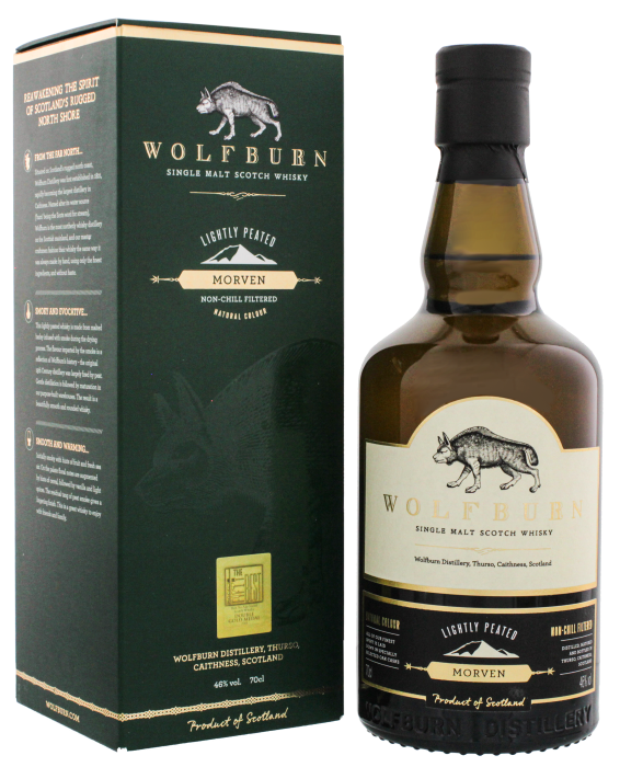 Wolfburn Morven Lightly Peated Single Malt Scotch Whisky Non Chill Filtered is een licht geturfde single malt afkomstig van de meest noordelijke distilleerderij “Wolfburn” op het vasteland van Schotland.